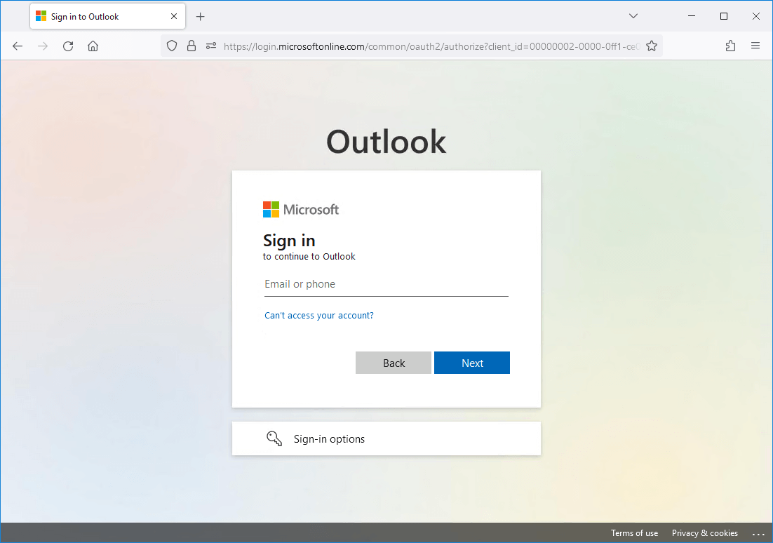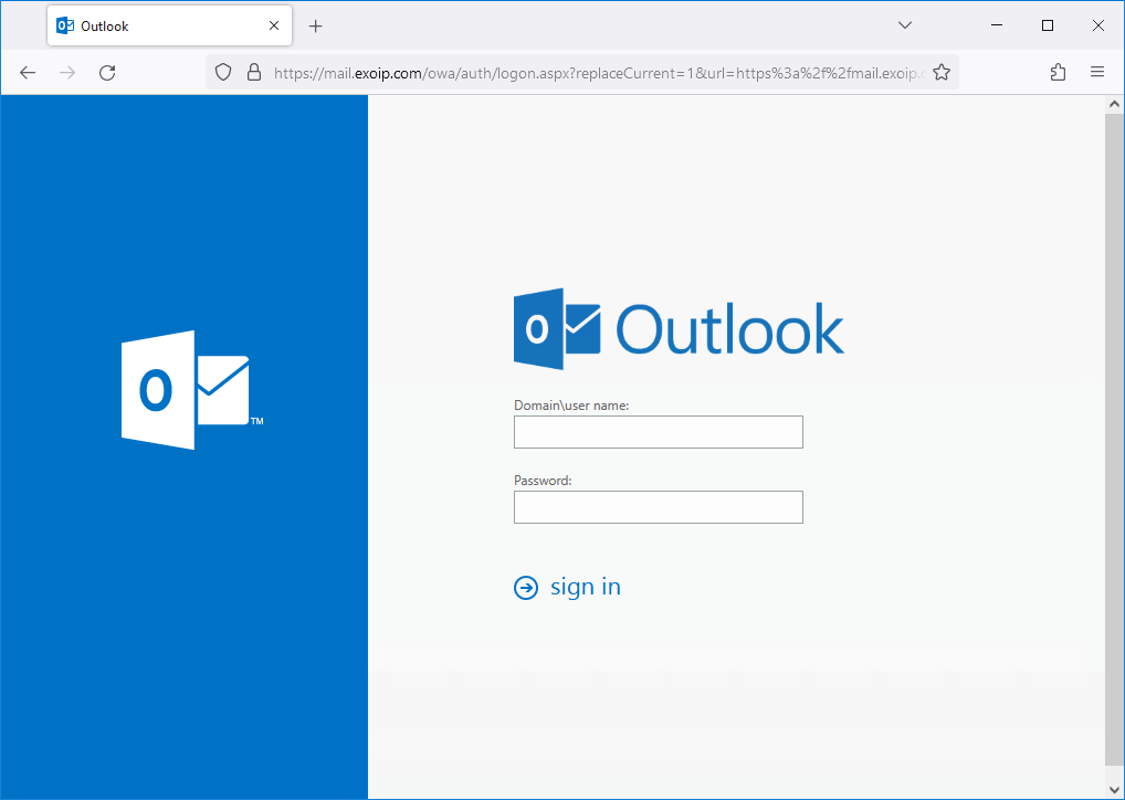 打开 Web 浏览器并填写 Exchange Server OWA 或 ECP URL。您将立即看到 Microsoft 登录 Outlook 屏幕。