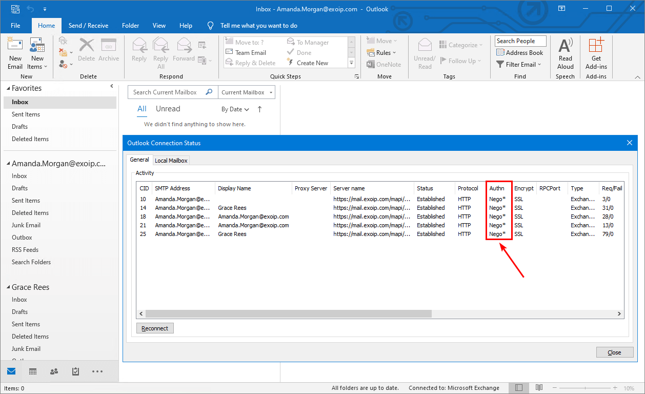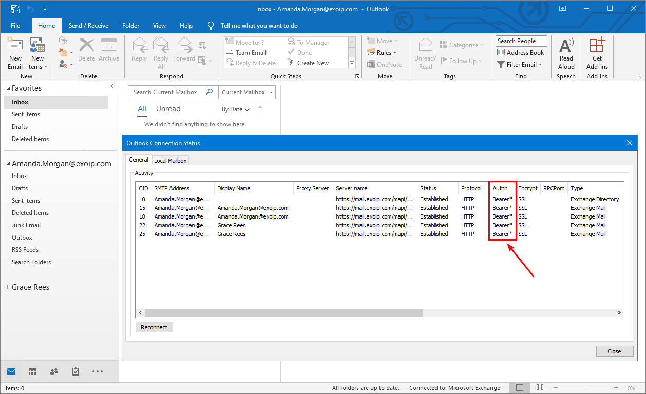 您可以按住CTRL 键和右键单击Windows 系统托盘中的 Outlook 客户端。点击连接状态。根据 Authn 类型查找客户端的 SMTP 地址持票人*,表示 OAuth 中使用的不记名令牌。