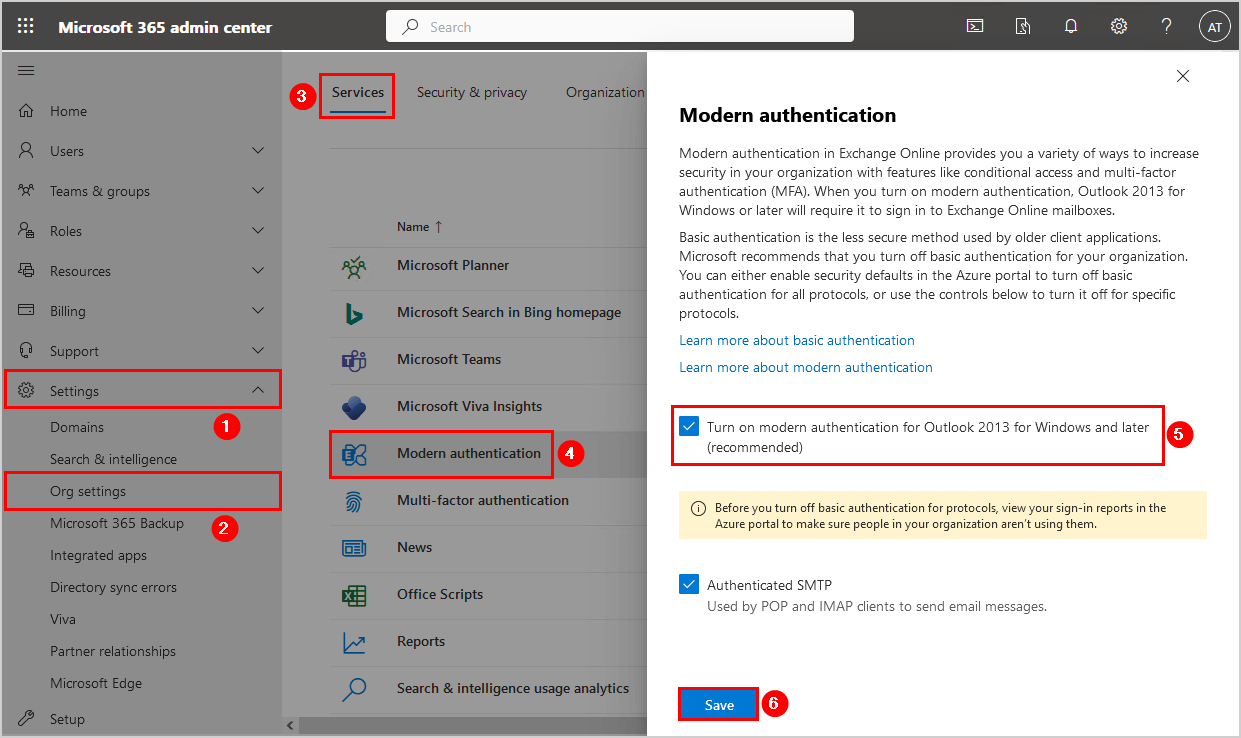要在 Exchange Online 中启用新式身份验证,请按照下列步骤操作: