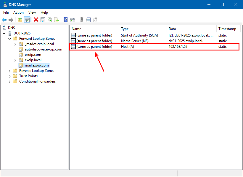 在我们的组织中,我们有以下用于 Exchange Server 设置的内部 DNS: