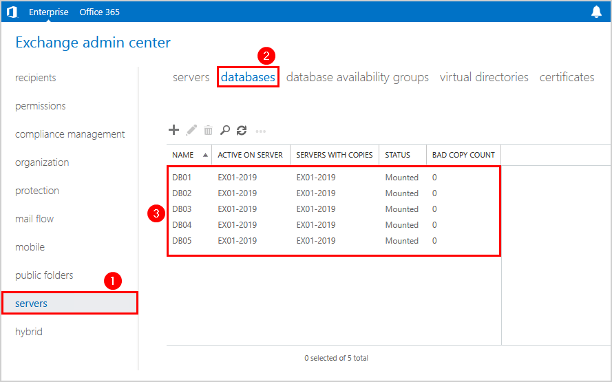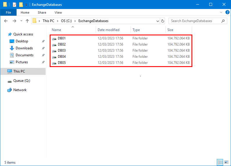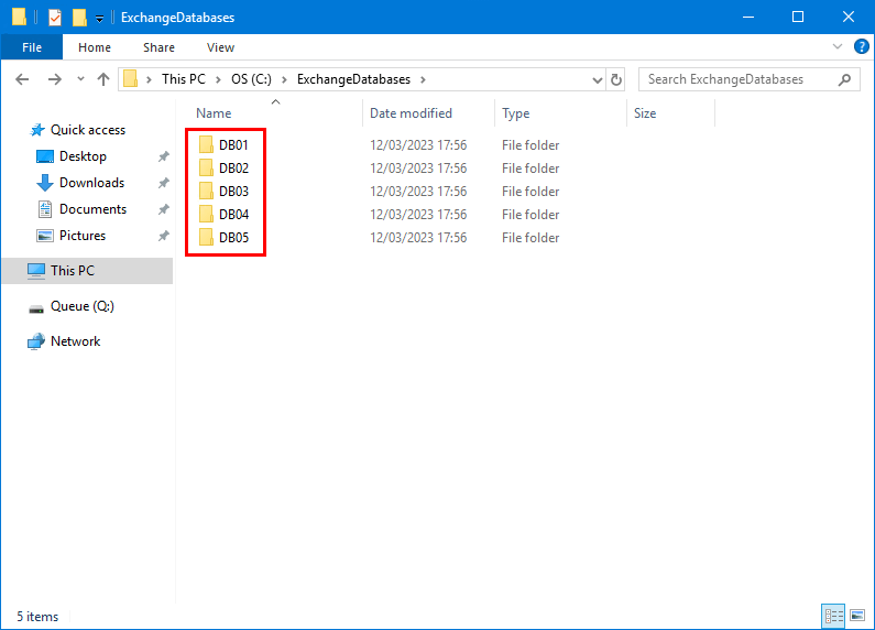 在我们的示例中,我们将创建5个邮箱数据库,因此我们使用邮箱数据库名称创建5个文件夹: