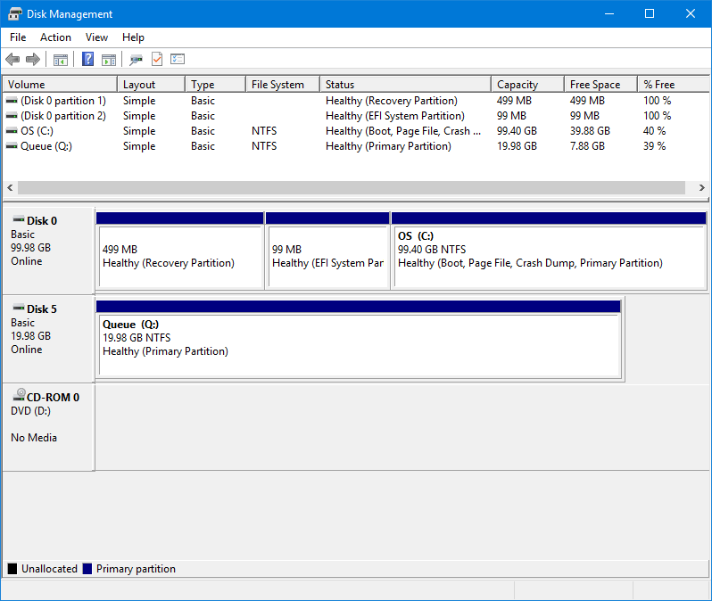 为所有其他卷执行相同的步骤。之后,请检查磁盘管理看起来不错。