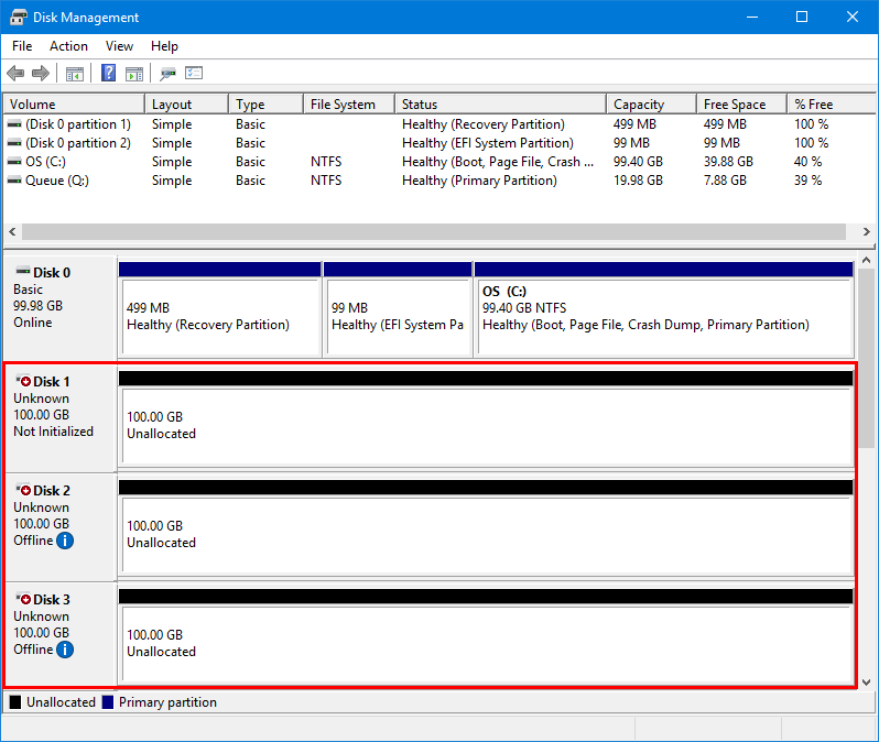 让我们将5个磁盘添加到Exchange Server并验证其外观。