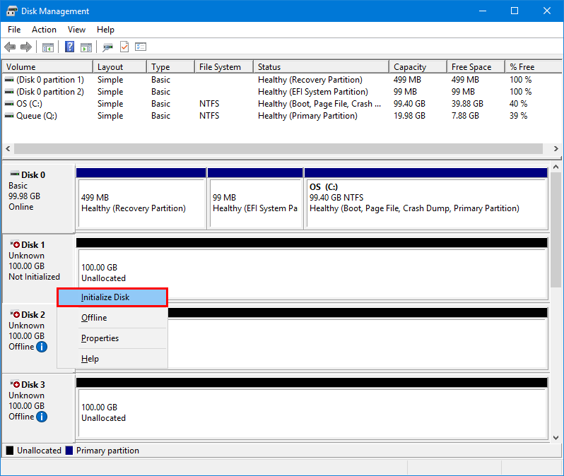 右键单击在新磁盘上选择初始化磁盘。如果磁盘离线,则必须首先选择在线的将磁盘在线上。