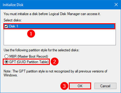 选择磁盘,选择GPT(GUID分区表),然后单击好的。