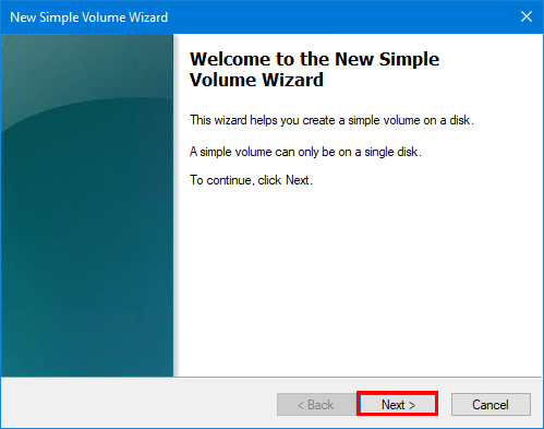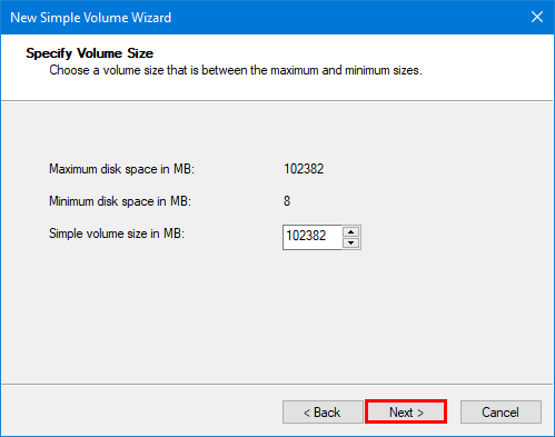 保持简单的音量大小(这是最大磁盘空间),然后单击下一个。