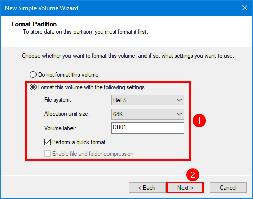 Get-Disk $disk | Initialize-Disk -PartitionStyle GPT -PassThru | New-Partition -UseMaximumSize | Format-Volume -FileSystem REFS -AllocationUnitSize 65536 -NewFileSystemLabel $DB -SetIntegrityStreams $false