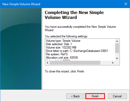 笔记:您可以为包含Exchange数据库文件,日志文件和内容索引文件的卷选择文件系统NTFS或REFS。但是我们建议裁判。确保您选择64 KB的分配单位大小。
