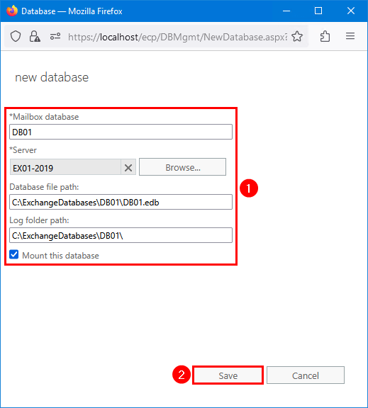 打开交换数据库文件夹并为邮箱数据库创建文件夹名称。