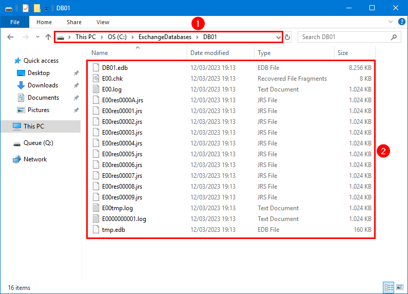 去C:ExchangedAbasesDB01文件夹并验证邮箱数据库及其日志。
