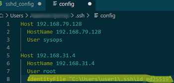 Host 192.168.31.4 HostName 192.168.31.4 User root IdentityFile "C:Usersuser1.sshid_ed25519"