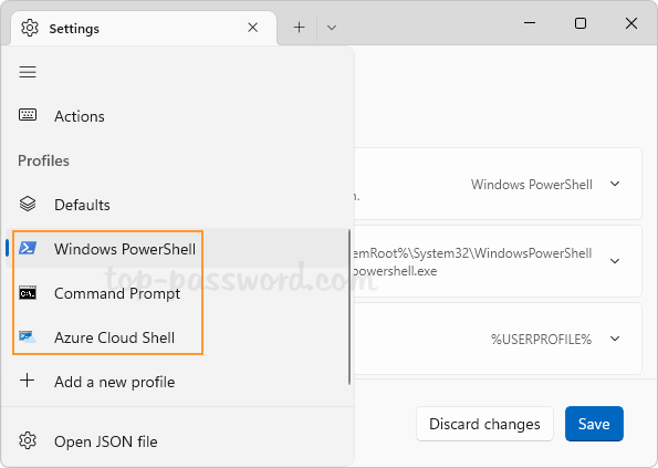 - 在左侧边栏上,我们可以在下面看到 Windows PowerShell、命令提示符、Azure Cloud Shell 的不同配置文件型材部分。