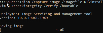 dism /capture-image /imagefile:D:install.wim /capturedir:E: /ScratchDir:D: /name:"MyWinImage" /compress:maximum /checkintegrity /verify /bootable
