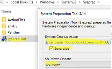 最后一步是准备自定义 Windows 映像以使用 sysprep.exe 工具进行部署。展开 Sysprep 窗口并选择以下选项: