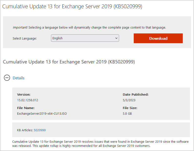 - 下载 Exchange Server 2019 的累积更新 CU13 (KB5020999)