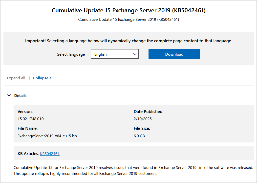- 下载 Exchange Server 2019 的累积更新 CU15 (KB5042461)