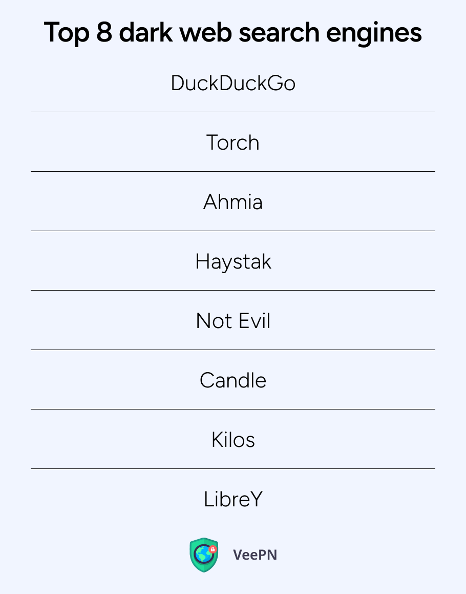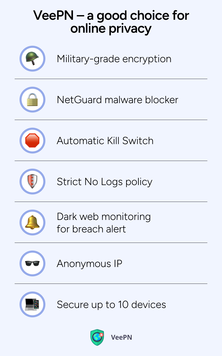 VeePN 旨在帮助您安全地探索互联网。无论是否使用 VeePN,我们根本不支持浏览暗网。但如果您想在表层网络和深层网络上同样保持安全,以下功能将会有所帮助: