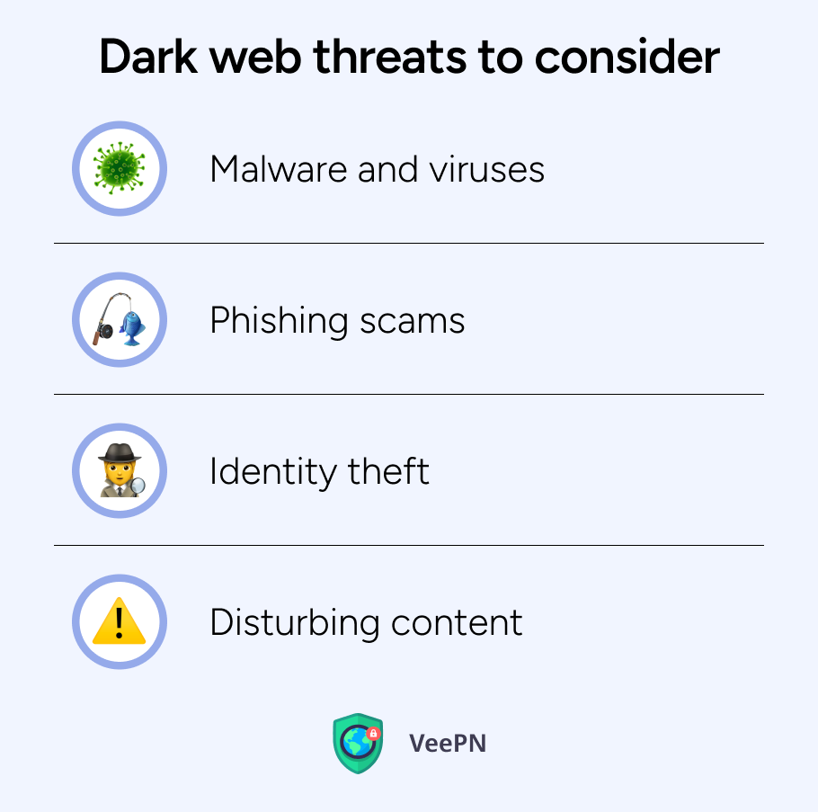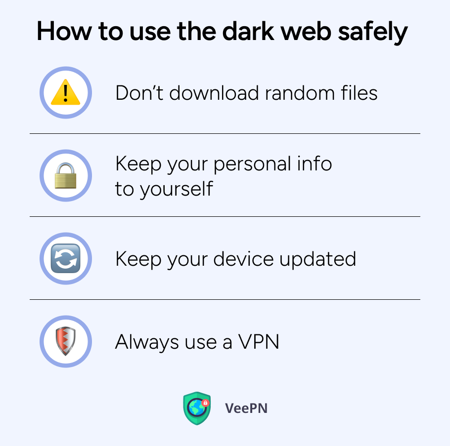如果您发现教程承诺“暗网安全安装”,“确实没有无风险的设置。没有一种方法是完全安全的。最好不要尝试。但如果您决定自行承担风险,那么您需要使用像 Tor 这样的暗网浏览器,安装像 VeePN 这样信誉良好且值得信赖的 VPN 来隐藏您的真实 IP 并加密您的数据以免被窥探。使用时,请跳过任何承诺“暗网安全下载。” 谨慎对待暗网会话,因为暗网会话之间存在一些差异表面网络和暗网。