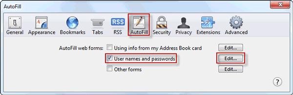第 2 步:在自动填充屏幕上,单击自动填充选项和打勾在用户名和密码前面。点击编辑按钮打开下一个窗口。