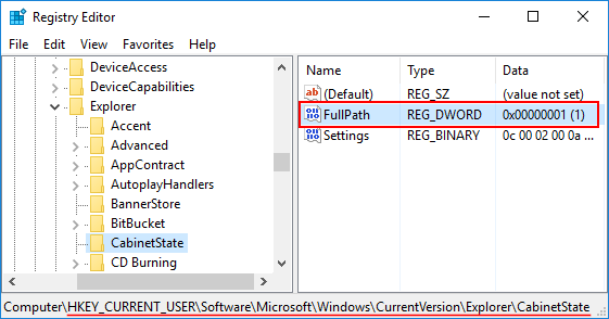 方法2:使用注册表编辑器使Windows 10在资源管理器标题栏中显示完整路径