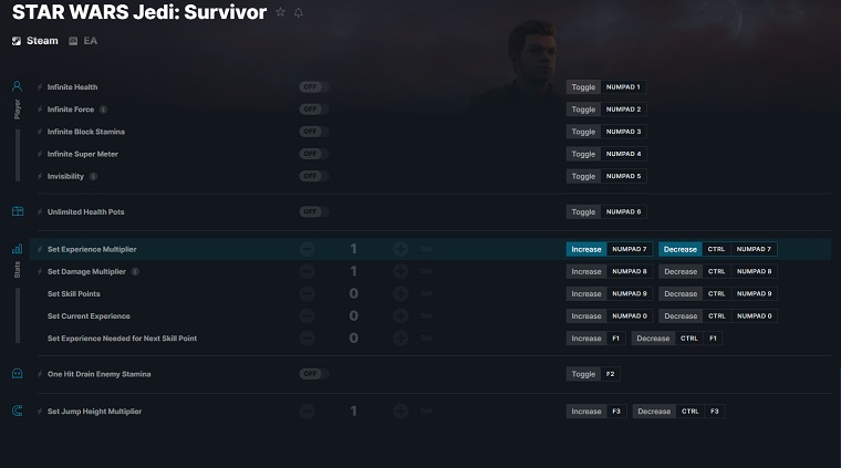 无畏革命提供的《星球大战绝地:幸存者》作弊引擎表为您提供了 16 个选项。
