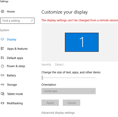 用户无法在 RDP 会话期间在显示面板中配置缩放设置,因为自定义显示选项处于非活动状态,并且会显示以下消息: