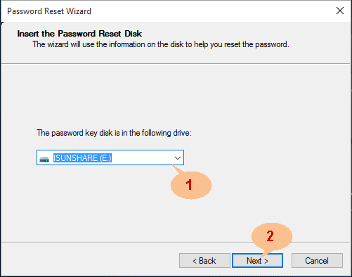 步骤3。当密码重置向导出现后,点击下一步按钮并选择连接的 USB 密码恢复盘。之后,单击“下一步”选项继续。