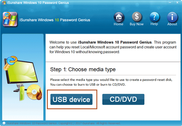 如果您没有管理员帐户的密码重置盘,您可以使用 USB 可启动盘重置 Windows 10 管理员密码。借助iSunshare Windows 10密码重置工具,可以轻松制作USB启动盘。您需要做的是:在可访问的计算机上安装 iSunshare Windows 10 密码重置工具将 USB 驱动器连接到可访问的计算机并运行密码重置工具选择“USB设备”单击“开始刻录”按钮。