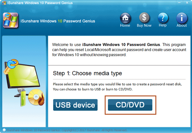 可以使用 iSunshare Windows 10 密码重置工具轻松创建 CD 安装光盘,并可用于轻松重置 Windows 10 管理员密码。通过软件制作和使用CD安装盘的详细步骤与USB安装盘相同(上述第一部分中的方法2)。