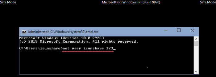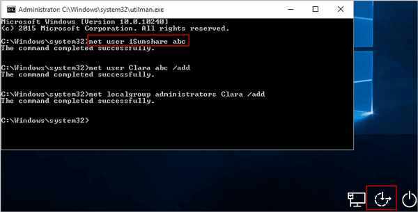步骤 5。在登录屏幕上,点击实用程序图标并在弹出的命令提示符窗口中键入 net user 命令行。按进入按钮,Windows 10 忘记的管理员密码重置成功。