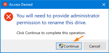 - 当您收到一条消息:“访问被拒绝 - 您需要提供管理员权限才能重命名此驱动器。”点击继续。