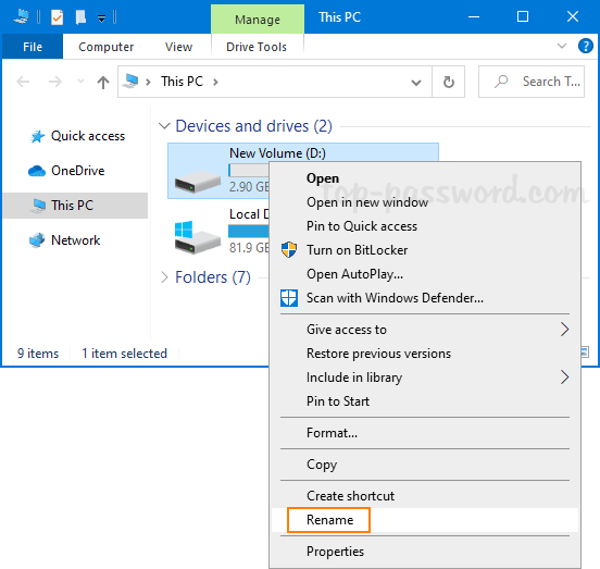 - 打开文件资源管理器并选择要重命名的驱动器,然后按F2,或右键单击该驱动器并选择“重命名” 从上下文菜单中。