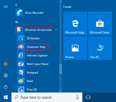 单击开始按钮。当“开始”菜单打开时,向下滚动到窗户配件文件夹。展开它,您将看到字符映射表快捷方式。