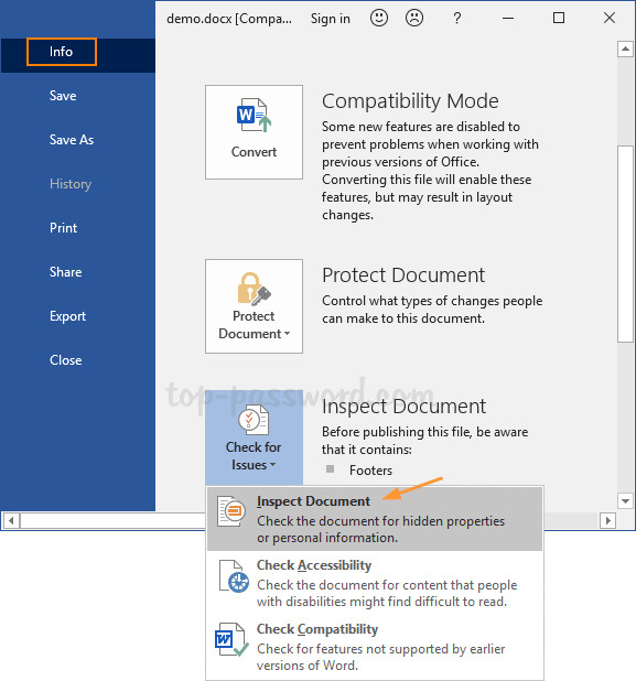 打开您的 Word 文档并转到文件功能区的选项卡。从信息窗格,单击检查问题然后选择检查文件从弹出菜单中。