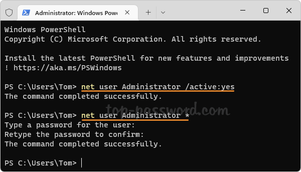 - 执行以下命令激活内置本地管理员帐户并设置新密码: