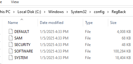 其中,这会运行 RegIdleBackup 任务。该任务从以下位置复制系统注册表文件(DEFAULT、SAM、SECURITY、SOFTWARE 和 SYSTEM)%windir%System32config到%windir%System32configRegBack文件夹。