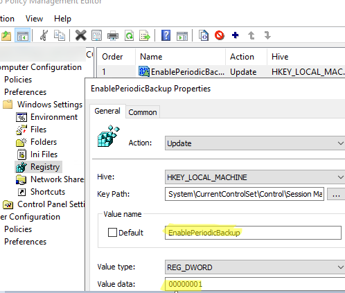 New-ItemProperty -Path "HKLM:SystemCurrentControlSetControlSession ManagerConfiguration Manager" -Name EnablePeriodicBackup -Type DWORD -Value 1