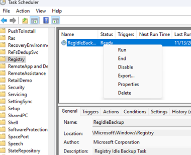 自动注册表备份将作为自动系统维护的一部分启动,方法是调用调节空闲备份调度程序任务。要手动运行此任务,请打开taskschd.msc并运行调节空闲备份任务在MicrosoftWindows注册表文件夹。