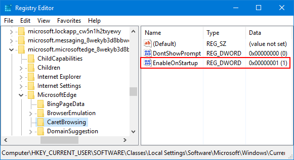 HKEY_CURRENT_USER\SOFTWARE\Classes\Local Settings\Software\Microsoft\Windows\CurrentVersion\AppContainer\Storage\microsoft.microsoftedge_8wekyb3d8bbwe\MicrosoftEdge\CaretBrowsing - 在右侧窗格中,双击 DWORD启动时启用修改。如果要启用插入符浏览,请将其值数据设置为 1,或者通过将其重置为 0 来关闭插入符浏览。
