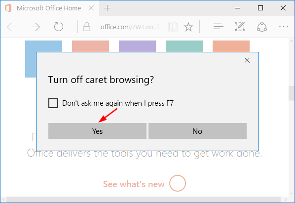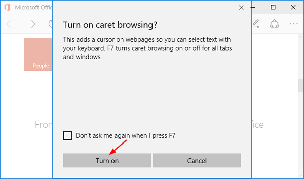打开 Microsoft Edge 并浏览到要选择文本的网页,按键盘上的 F7 键。这将弹出一个确认窗口,询问您是否要打开插入符浏览。选择是的将其打开。