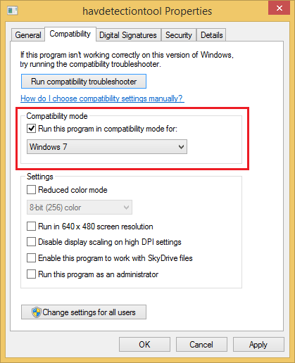 - 右键单击 EXE 文件 (havdetectiontool.exe),然后单击特性。