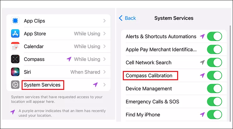第5步:要启用该设置,请点击指南针校准右侧的开关将其打开。