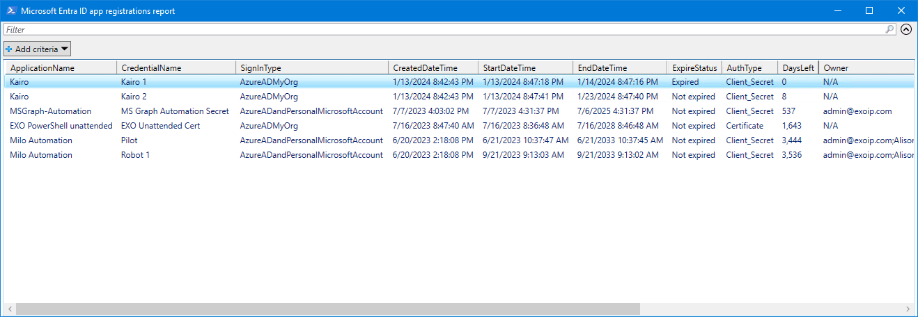 $Report | Out-GridView -Title "Microsoft Entra ID app registrations report"