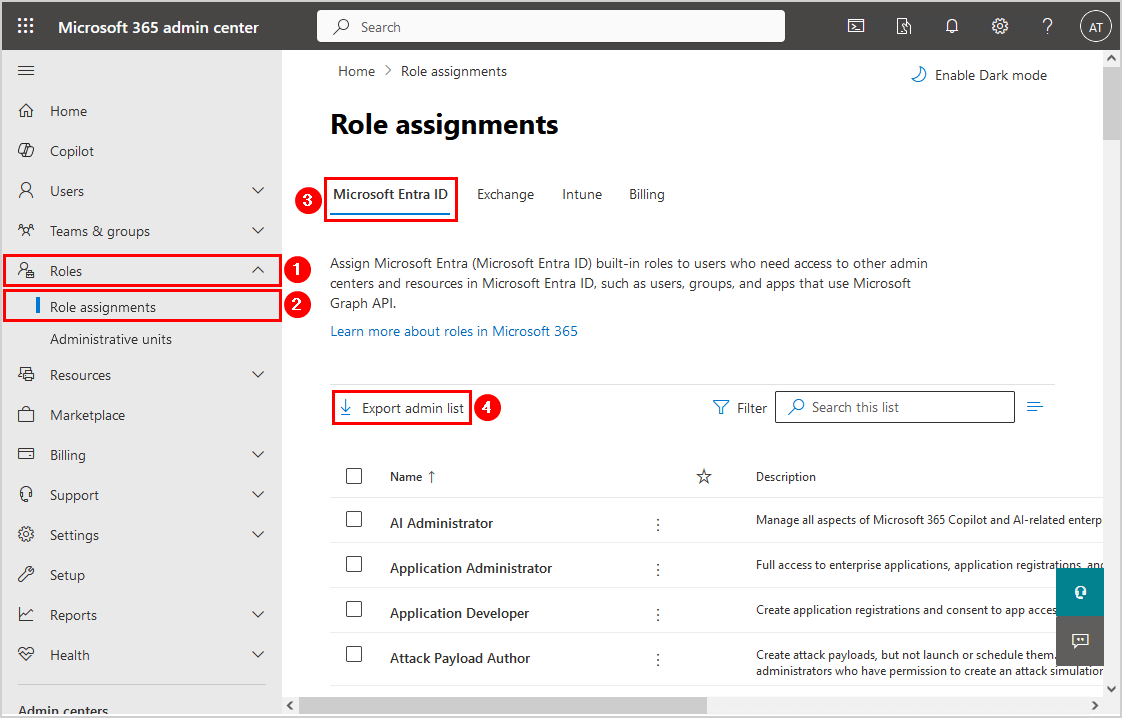 要导出 Microsoft 365 中的管理员角色成员,请按照以下步骤操作: