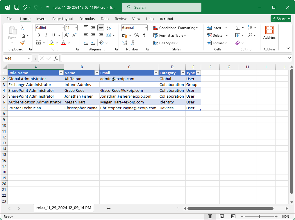 - 打开 Microsoft Entra ID/Microsoft 365 管理员角色报告 CSV 文件