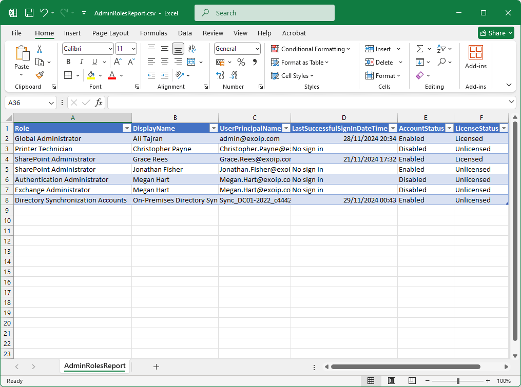 Export-M365AdminRoles.ps1 PowerShell 脚本将获取 Microsoft 365/Entra 租户中具有管理员角色的所有用户。之后,它将报告导出为 CSV 文件。您可以使用 Microsoft Excel 或支持 CSV 文件扩展名的任何其他应用程序打开 CSV 文件。