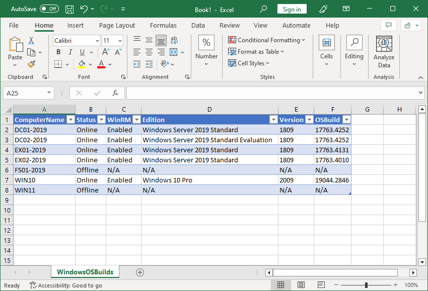 $results | Sort-Object ComputerName | Select-Object ComputerName, Status, WinRM, Edition, Version, OSBuild | Export-Csv -Path "C:TempWindowsOSBuilds.csv" -NoTypeInformation