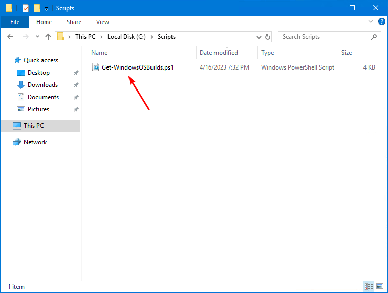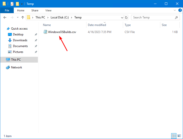 下载 Get-WindowsOSBuilds.ps1 PowerShell 脚本并将其放入C:脚本文件夹。该脚本会将 CSV 文件导出到C:温度文件夹。