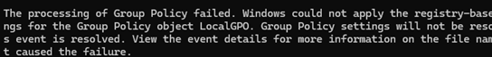 The processing of Group Policy failed. Windows could not apply the registry-based policy settings for the Group Policy object LocalGPO. Group Policy settings will not be resolved until this event is resolved. View the event details for more information on the file name and path that caused the failure.