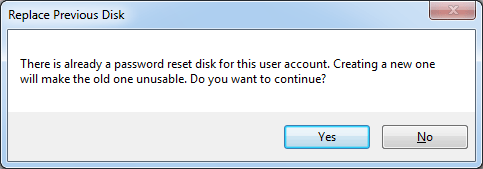 每个帐户只能创建一个密码重置磁盘。当您尝试创建另一个密码重置磁盘时,您会收到警告消息:“此用户帐户已经有一个密码重置磁盘。创建一个新的磁盘会使旧一个无法使用。您想继续吗?”